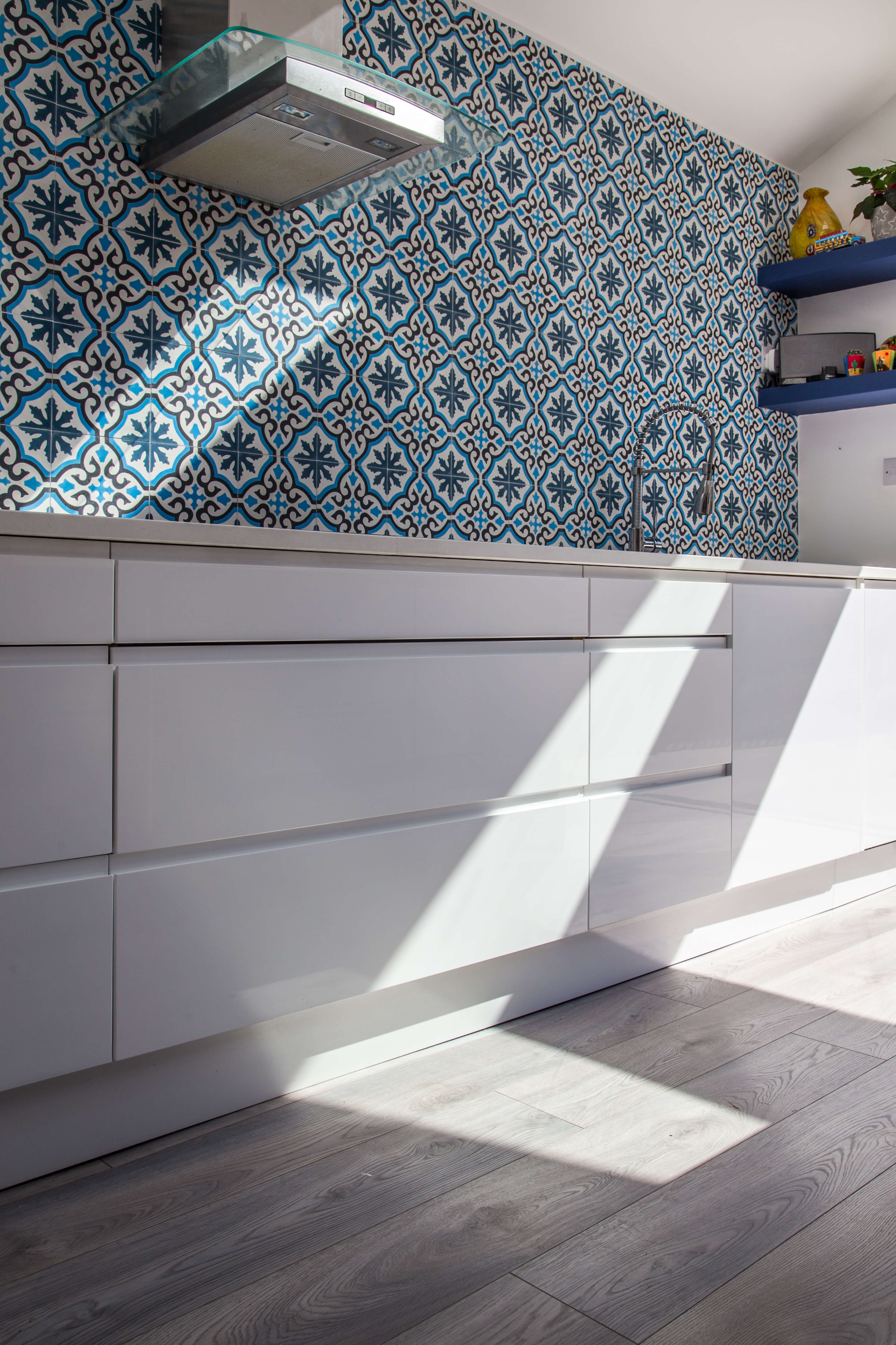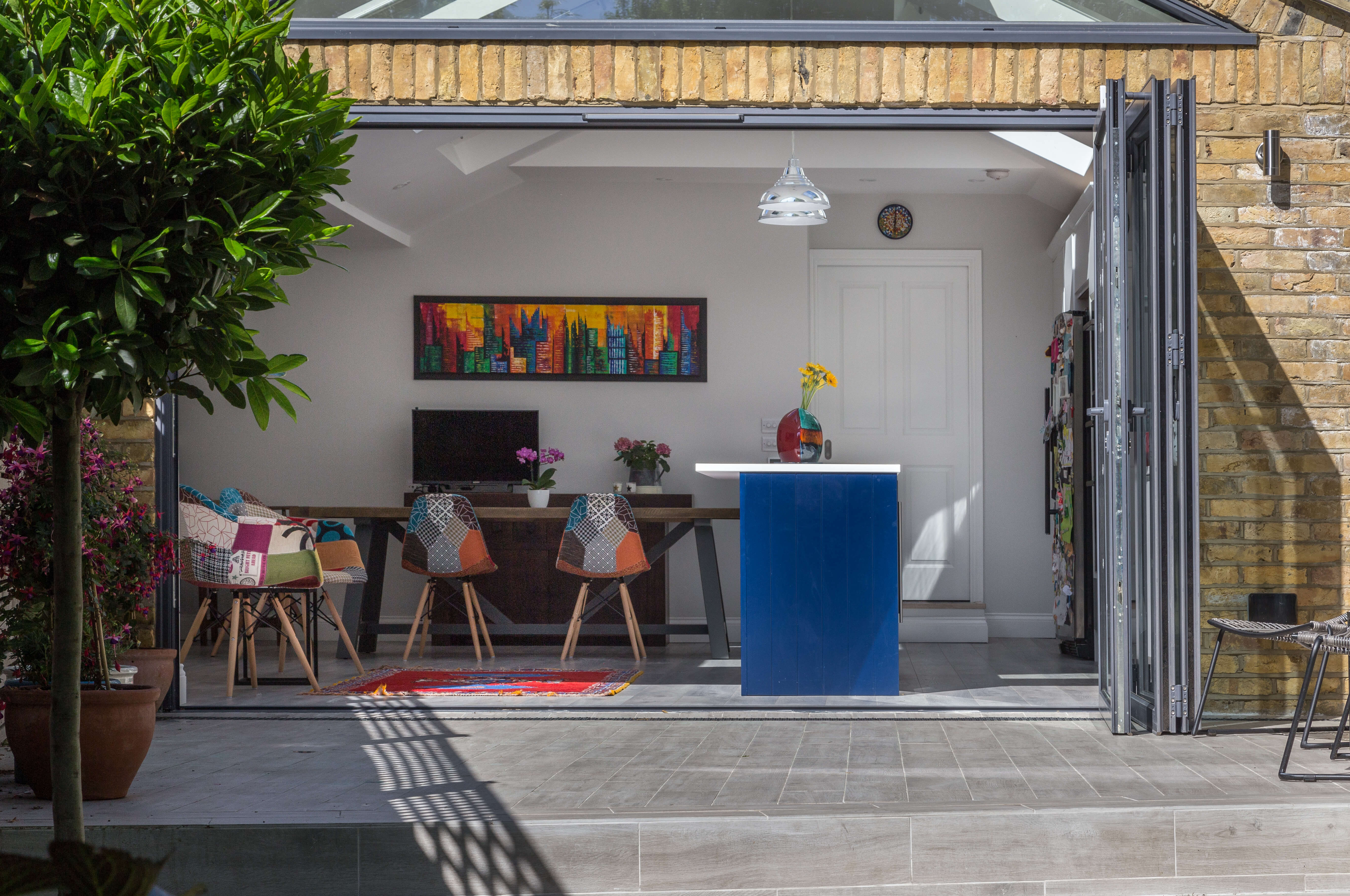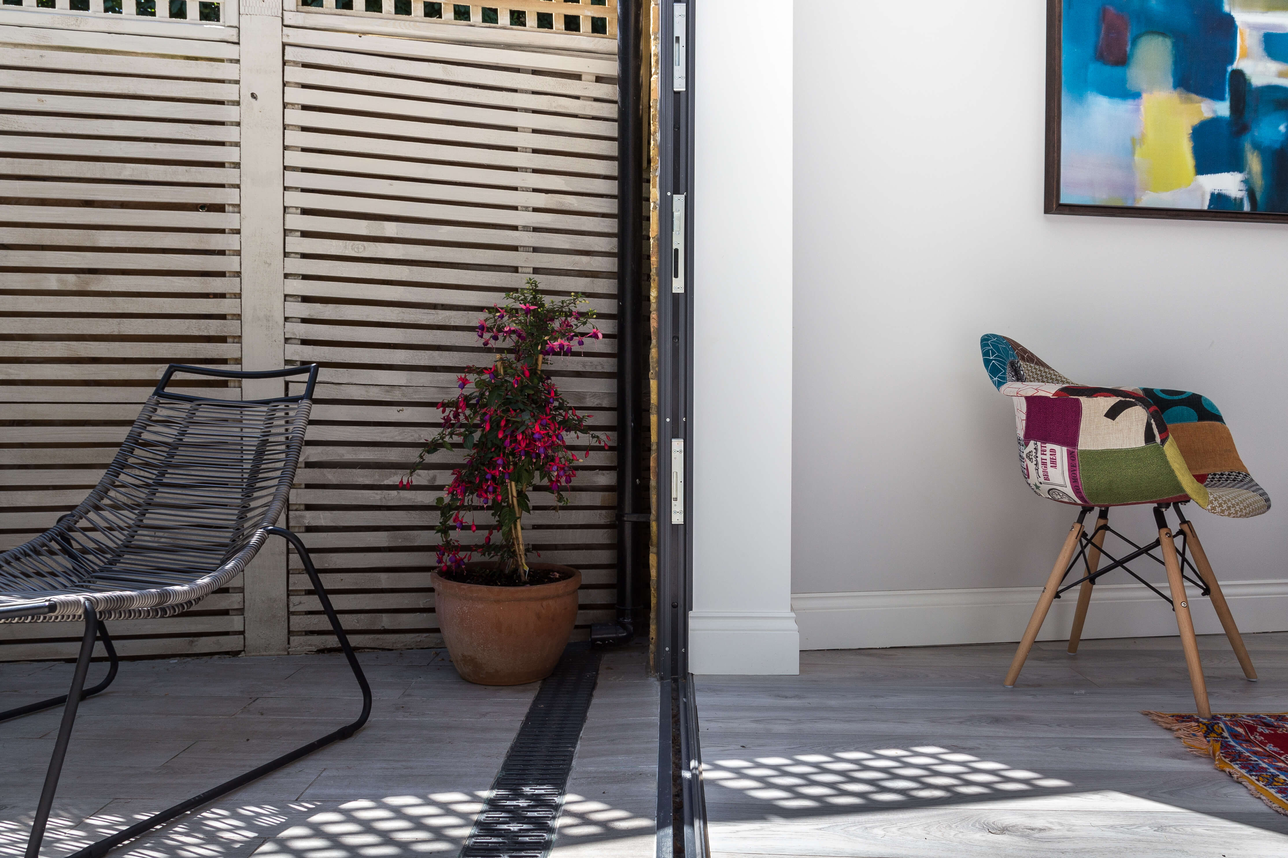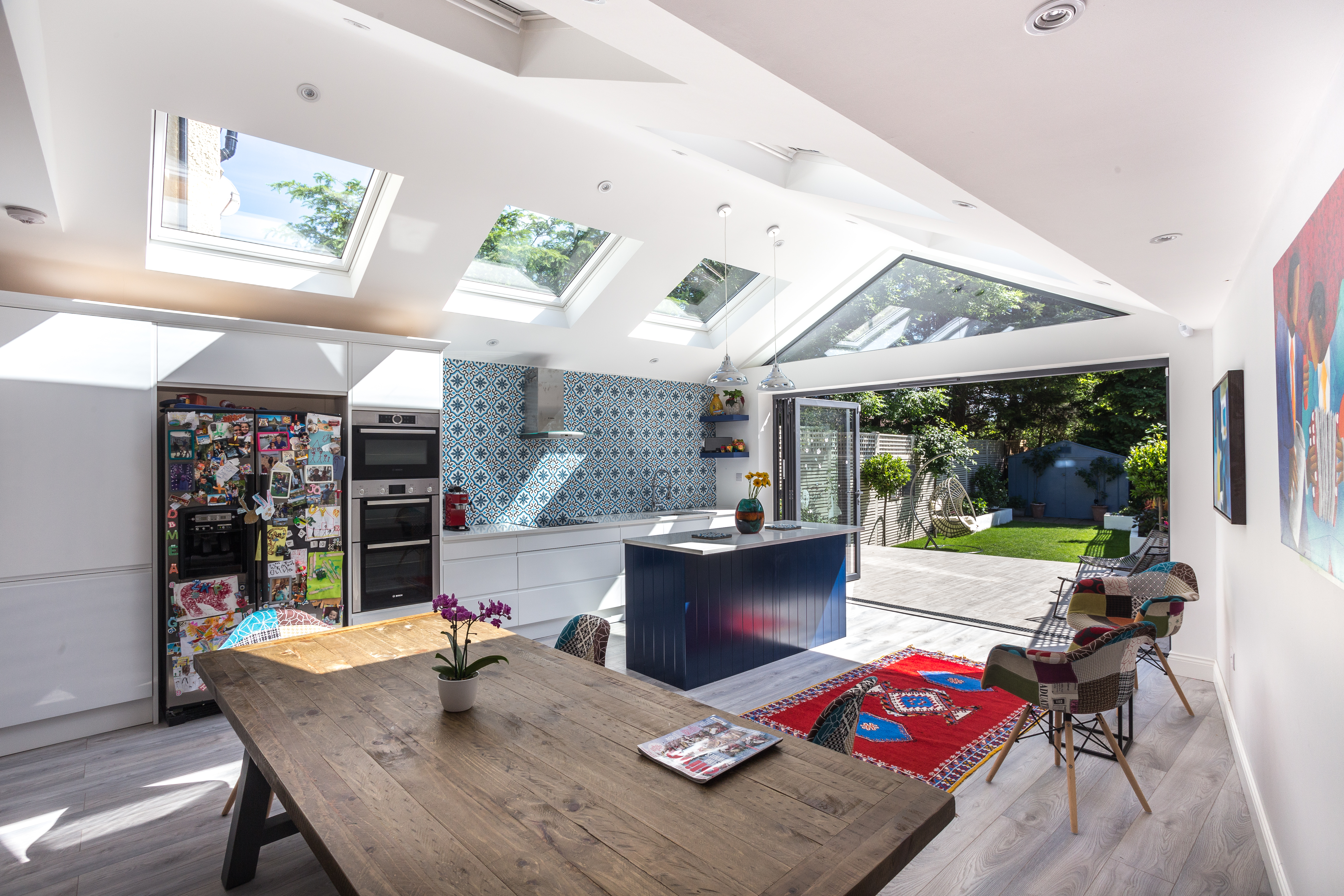 The ground floor of this three-bedroom property in Richmond was altered and extended to create an open living/dining space whilst the front of the property retains its purpose as a formal reception room. A new modern kitchen was designed and added with interesting patterns and textures to offer a contemporary twist. Roof lights were introduced over the kitchen and dining table to allow natural sunlight into the space for family dining.